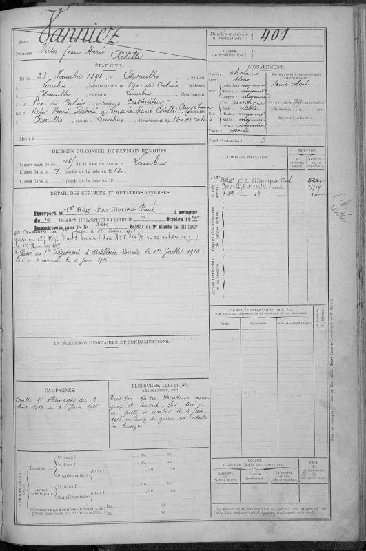 Victor Vanniez est né à Escoeuilles le 23 novembre 1893 (d’après le registre d’état civil. Il y a donc une erreur sur sa tombe où il est noté 21novembre…). Il est cultivateur. A 21 ans, il est incorporable et rejoint le 1er régiment d’artillerie à pied le 10 octobre 1912, sous le matricule 401 au titre de soldat de 2ème classe. Le service militaire dure à cette époque 2 ans et passera à 3 ans en 1913